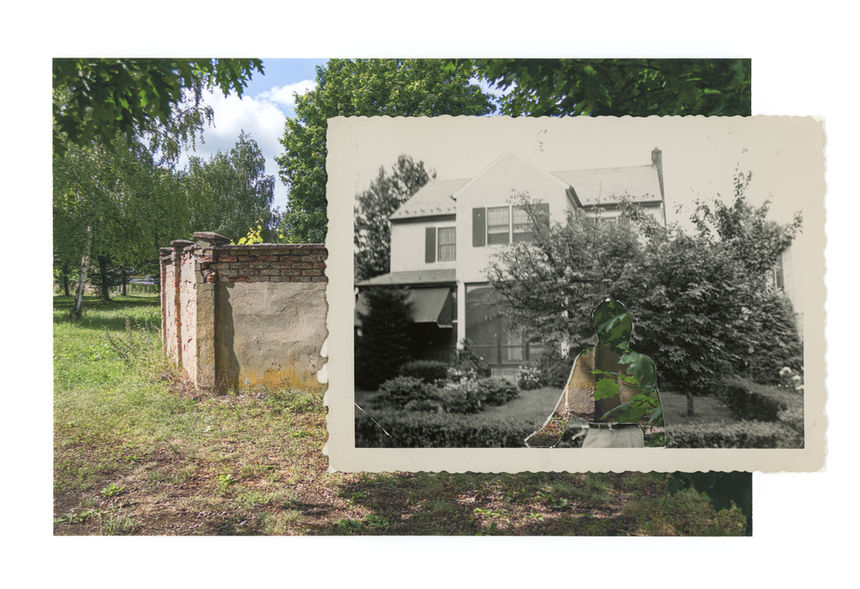 Outer Wall, Sachsenhausen, 2025, 4.75 x 7.75” photo collage (physically altered family photo & pigment print) on rag paper in 20 x 16” custom maple frame